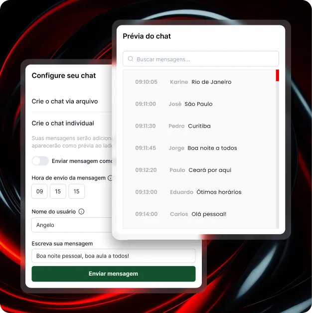 Defina a audiência simulada, programe as mensagens estratégicas do chat e configure notificações de compra para criar o ambiente perfeito que transforma visitantes em compradores.