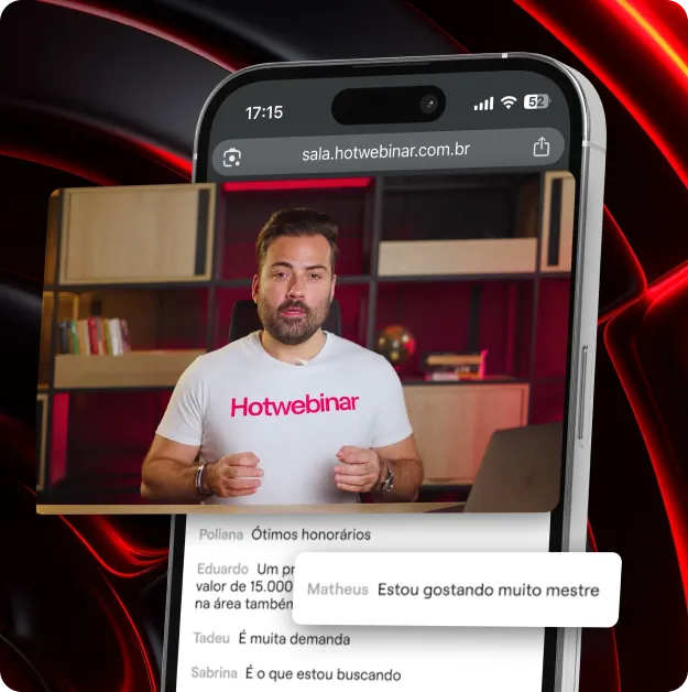 A Hotwebinar é a primeira plataforma com chatbot integrado para webinários. Ele responde dúvidas em tempo real, elimina objeções e conduz o lead até a compra — sem depender de você estar online.