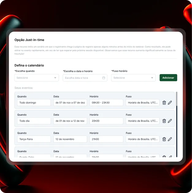 Escolha quando seu webinário “ao vivo” acontecerá – pode ser várias vezes por dia, todos os dias, nos horários de maior conversão para seu público específico.