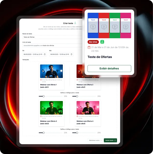 Decisões baseadas em “achismos” desperdiçam seu orçamento e eliminam oportunidades valiosas de otimização. O sistema de testes da Hotwebinar compara até 4 variações do seu webinário, permitindo descobrir o que melhor funciona com seu público.