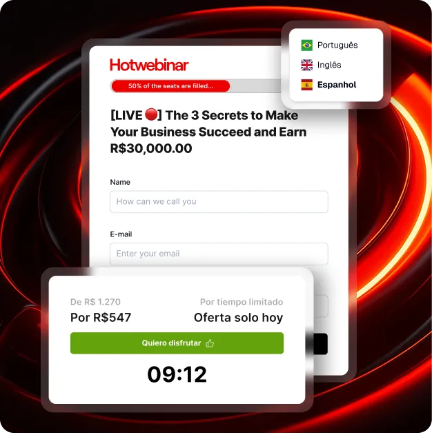 Seu produto tem potencial global, mas sua comunicação está presa a um único idioma? A Hotwebinar traduz automaticamente toda a estrutura da sua sala de webinário para o idioma nativo do participante.