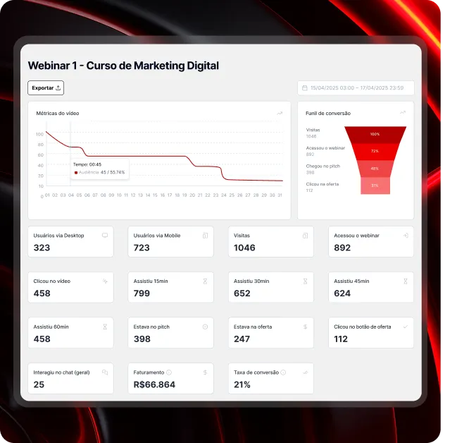 O sistema mapeia cada segundo da jornada do participante, permitindo segmentar o follow-up: reforço para quem viu a oferta, reengajamento para quem saiu antes do pitch e recuperação para quem clicou mas não comprou.